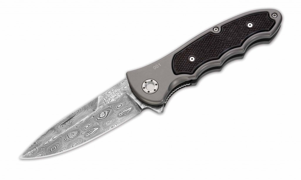 Třetí generace tohoto nože. Je zcela vyroben ručně. Čepel je kovaná z nástrojové oceli (chrom-, manganu a vanadium legované) a oceli 1.3505, s více než 300 vrstev Damašku oceli.Výsledkem je leopardí Damašek s jedinečnými řeznými vlastnostmi a tvrdostí 61 až 63 HRC. Rukojeť CNC-frézovaného AlMgSi1 hliníku, který je eloxovaný v olivové šedi a je umístěn v krásném kontrastu dřeva grenadilla.Dodává se ve vzácné dřevěné sběratelské krabici s certifikátem pravosti.
