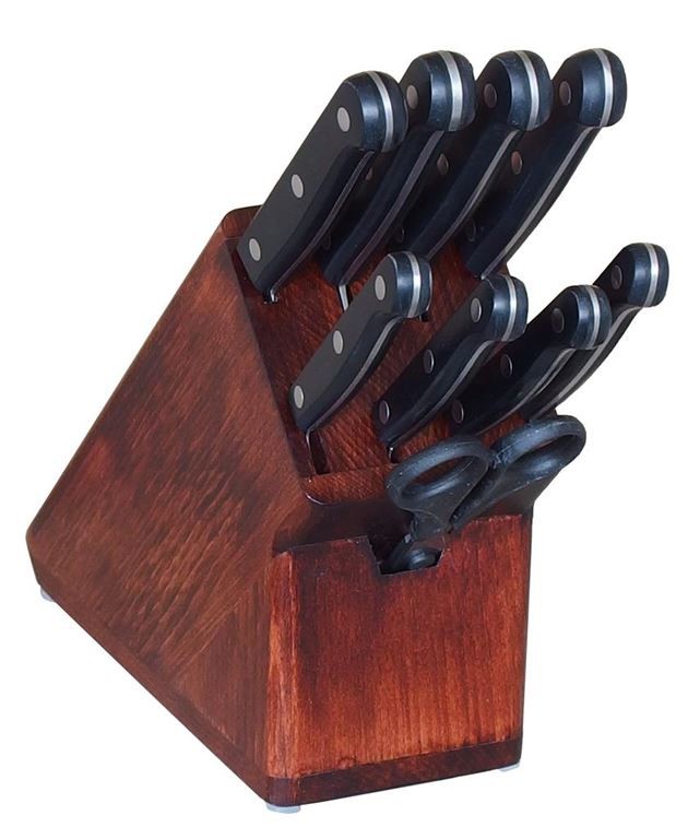 Blok na nože z bukového dřeva, obsahující 8 kuchyňských nožů Trend a nůžky pro domácnost.