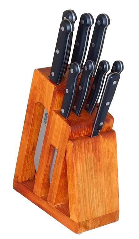 Otevřený blok na nože z bukového dřeva, obsahující 8 kuchyňských nožů a vidlici z řady Trend.