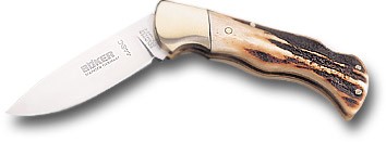 Boker nůž nejen pro myslivost. Tato skládací lockback má mosazné vložky.K noži je kvalitní kožené pouzdro.Celková délka: 17.5 cm. Délka čepele:8,0cm.Váha:120g.Ocel:440C.Rukojet':Jelení paroh.