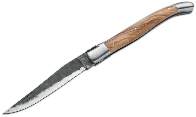 Rukojeť z olivového dřeva s nerezovým zdobením. Kovaná čepel s kováním ve vzoru kůže.