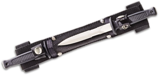 Tento nůž lze připevnit na opasek vodorovně.Z oceli 420 na obou stranách částečně zoubkované ostří. Kraton na rukojeti poskytuje nejlepší zacházení.