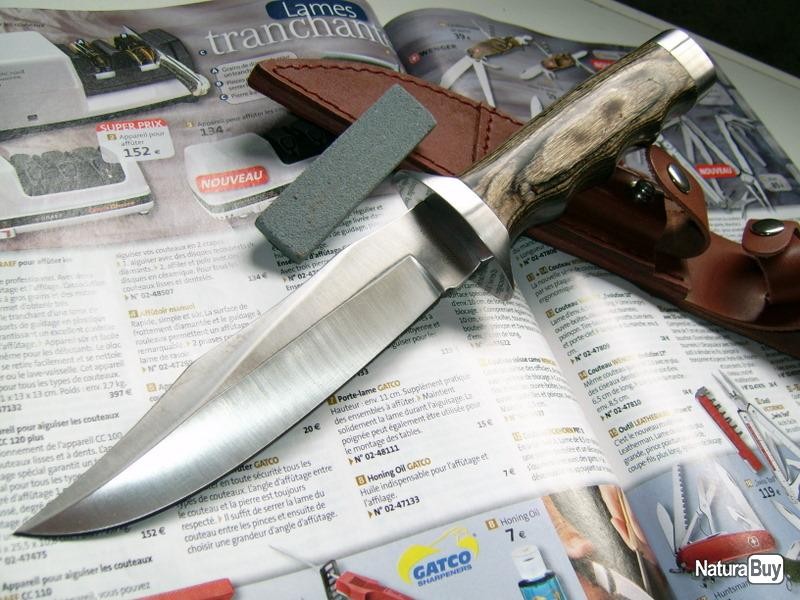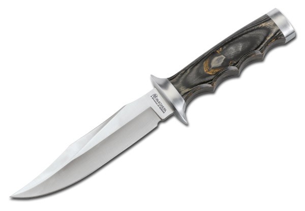 Výkonný pevný nůž s dlouhou čepelí Bowie z nerezové oceli 440. Rýhovaná rukojeť nabízí atraktivní vrstvené dřevo. Zahrnuje hnědé kožené pouzdro s přední kapsou a brusným kamenem.