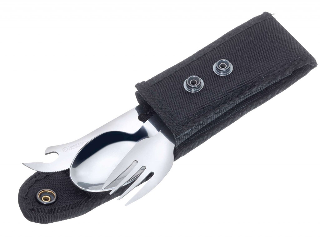 Tato sada příborů pro piknik a venkovní použití zahrnuje vidličku, lžíci a nůž s integrovaným nerezové oceli otvírák na konzervy, dodáváno v kordurovém pouzdře s poutkem na opasek. Rozměry nože: Celková délka 14,3 cm. Čepel 4,9cm. Tloušťka 2,4 mm. Hmotnost přístroje: 100 g