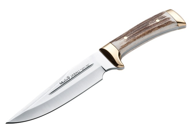 Střenka rukojeti z jeleního paroží. Saténově upravená čepel je vyrobena ze španělské oceli MOVA, molybdenu vanad oceli s tvrdostí 57 až 61 HRC Rockwell. Dodáváno s koženou pochvou.