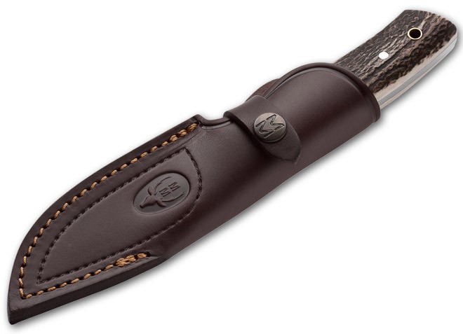 Muela Kodiak Stag – lovecký nůž s nikl stříbrnou záštitou a střenkou z jeleního paroží. Saténově upravená čepel je vyrobena ze španělské oceli MOVA, molybdenu vanad oceli s tvrdostí 57 až 61 HRC Rockwell. Dodáváno s koženou pochvou.
