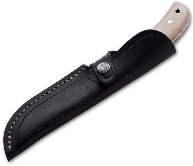 Nikl stříbrná záštita. Střenka ze slonoviny a Micarty s červenou linií. Saténově upravená čepel je vyrobena ze španělské oceli MOVA, molybdenu vanad oceli s tvrdostí 57 až 61 HRC Rockwell. Dodáváno s koženou pochvou.