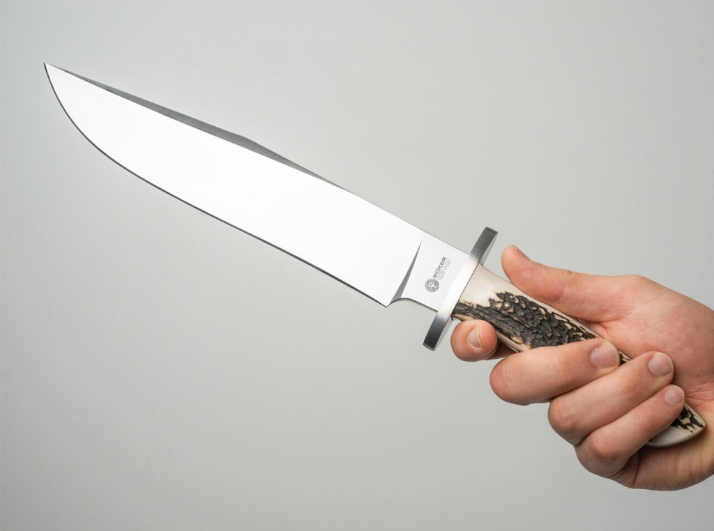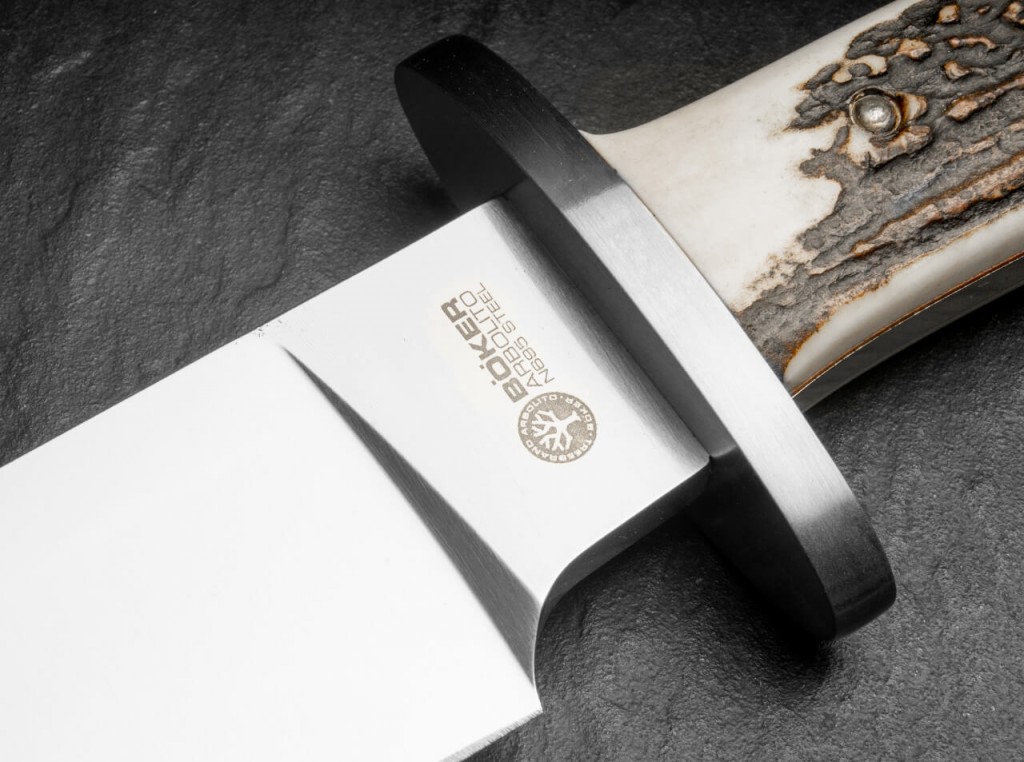 S jeleními šupinami uzavíráme mezeru v dosahu El Gigante. Extrémně robustní nůž Bowie ve full-tang konstrukci již inspiroval mnoho outdoorových nadšenců a lovců. Díky šupinám z vybraného jeleního rohu je nyní dokonale vybavený pro lovecké použití a přesvědčí jako stojící kel i jako účinný odchytový nůž na divoká prasata nebo větší jeleny. Čepel loveckého nože je vyrobena z N695, záštita je vyrobena z nerezové oceli. Dodáváno s vysoce kvalitním koženým pouzdrem.
