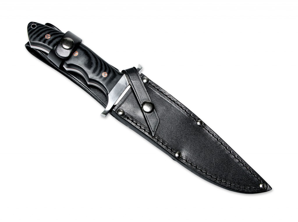 Moderní interpretace klasických vietnamských bowies od Boker Plus. Čepel má saténovou povrchovou úpravu vycházející do dvou různých směrů (pro dvoubarevný povrch), má působivou tloušťku 6 mm a je vyrobena z nerezové oceli 440C s vynikající schopností držení ostří. Záštita je vyrobena z nerezové oceli a nabízí dostatek bezpečnosti i při použití v drsném terénu. Značně broušené rukojeti z micarty jsou ergonomicky tvarované pro pohodlné a bezpečné uchopení a na spodní straně obsahují vrstvu červených vláken. Rukojeti jsou připevněny ke špičce pomocí mozaikových špendlíků, které jsou běžně vidět pouze na zakázkových nožích kvůli nákladné výrobě a vytvářejí jedinečný vzhled. Povinná výbava pro sběratele! Se svou osvědčenou koncepcí a robustními rozměry může být také použit jako spolehlivý outdoorový nůž pro různé řezné práce. Obsahuje otvor pro šňůrku a prvotřídní pochvu z pravé kůže.