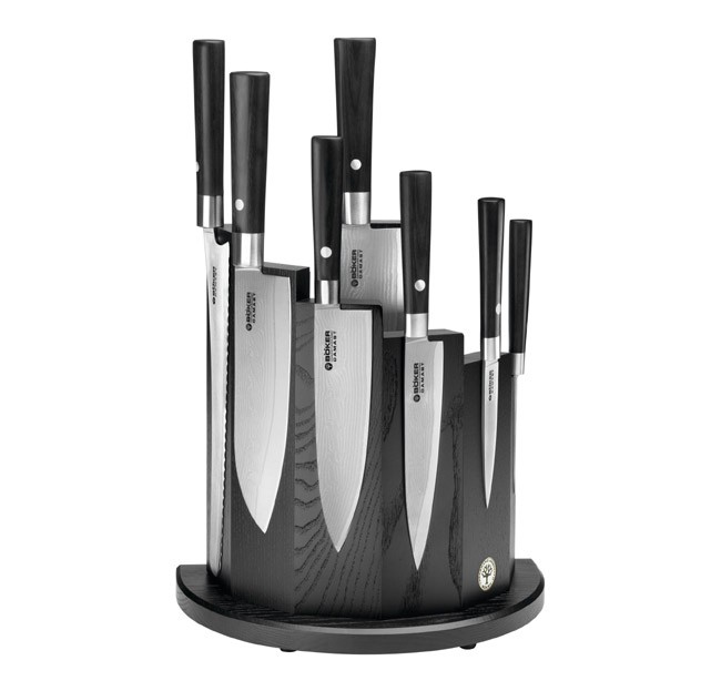 Tyto stylové kuchyňské nože z Bokeru jsou opravdu uměleckým dílem. Damašková ocel vyrobena z 37 vrstev nerezové oceli VG10. Poskytuje vynikající stabilitu ostří při každodeních řezných úkonech. Rukojeť je z černého vrstveného dřeva, nerezovým kroužkem a čepem. Každý nůž je dodáván v dárkové krabičce vyložené hedvábím.