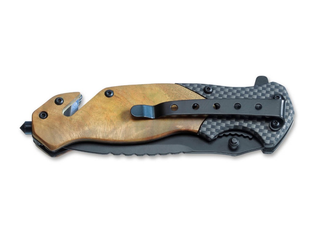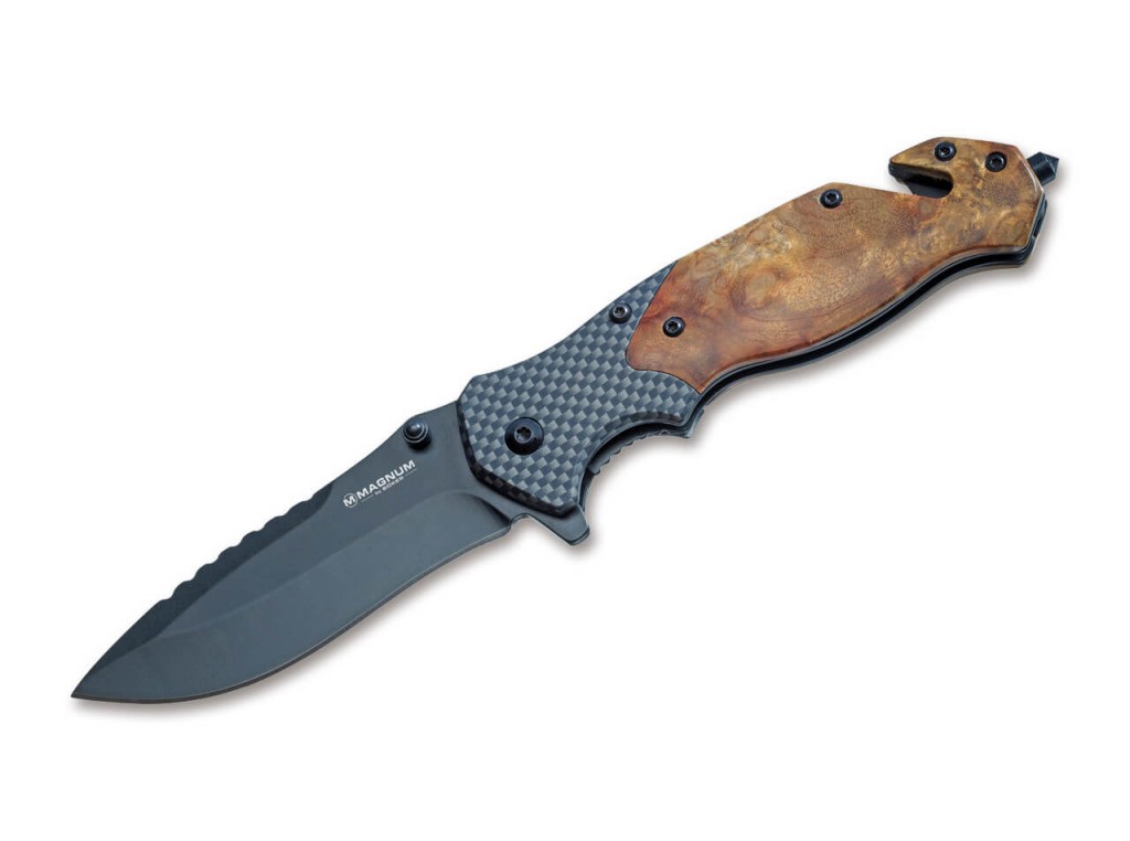 Kapesní nůž, který nemůže být komplexnější. Magnum Blomkvist nabízí tři funkce - čepel, rozbíječ skla a řezačka pásu. Dodává se s praktickým nylonovým pouzdrem na opasek s další kapsou na brousek. Čepel z nerezové oceli 440A potažená titanem se otevírá ploutvou nebo palcem a je zajištěna robustním zámkem. Váhy rukojeti z mramorovaného kdoulového dřeva dodávají noži teplý a přirozený vzhled a nabízejí zajímavý kontrast k moderním podložkám v karbonovém stylu. Špičkové pouzdro opasku lze nosit na opasku svisle nebo vodorovně. Pro více možností nošení a větší flexibilitu má všestranný Blomkvist také klip pro hluboké nošení (sklopný).