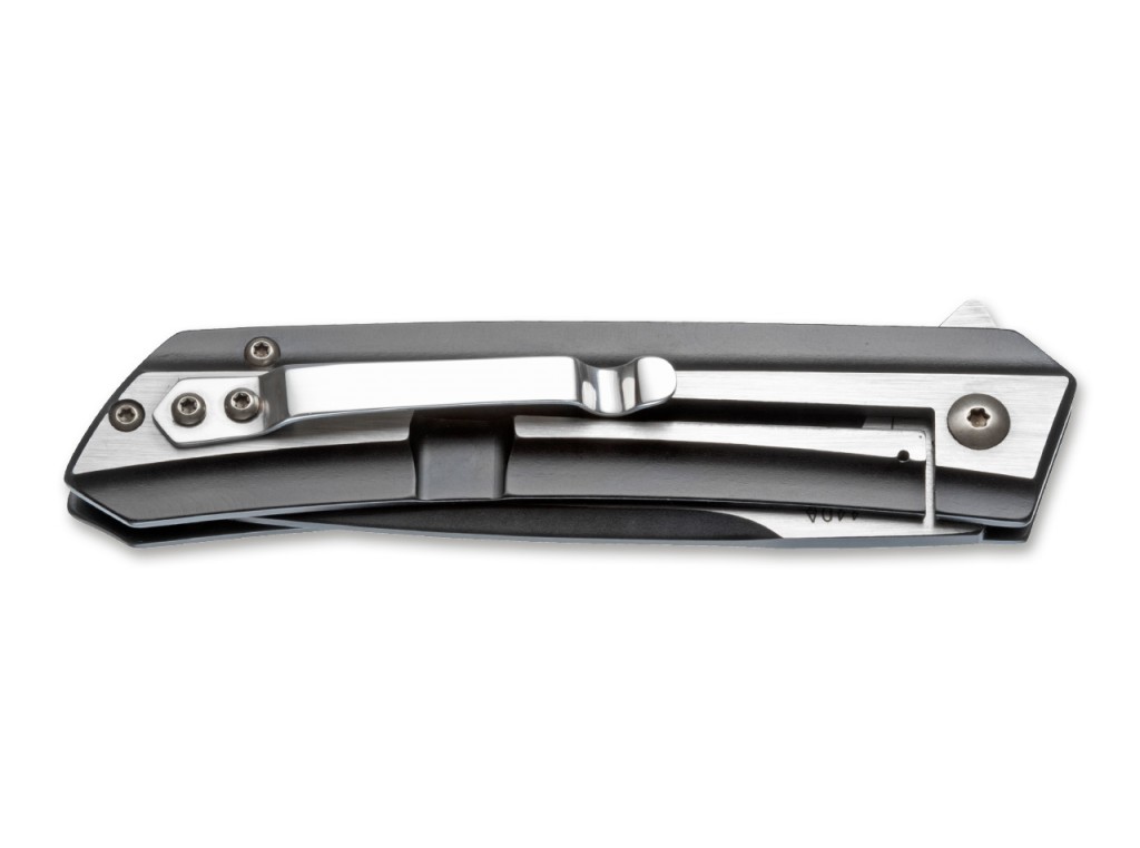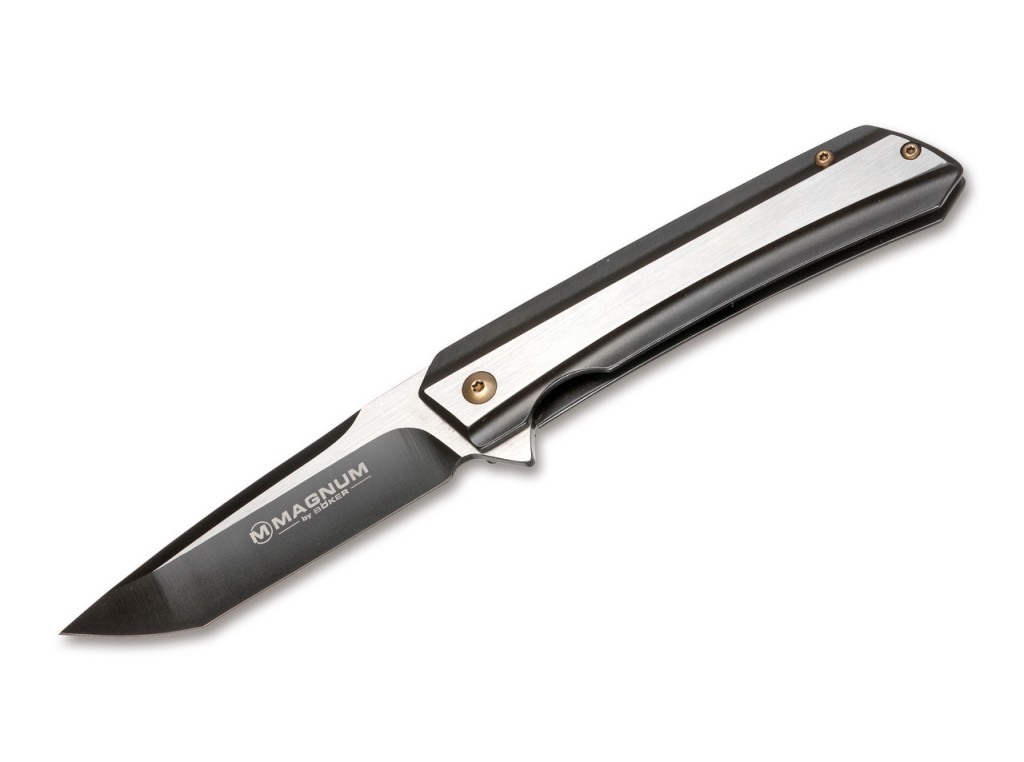 Magnum Contrast je pozoruhodná složka Tanto. Na čepeli a držadle se černě potažené oblasti střídají se satinovanými, což vytváří atraktivní vizuální kontrast. Čepel z nerezové oceli 440A se otevírá pomocí ploutve a je zajištěna robustním zámkem rámu. S klipem.