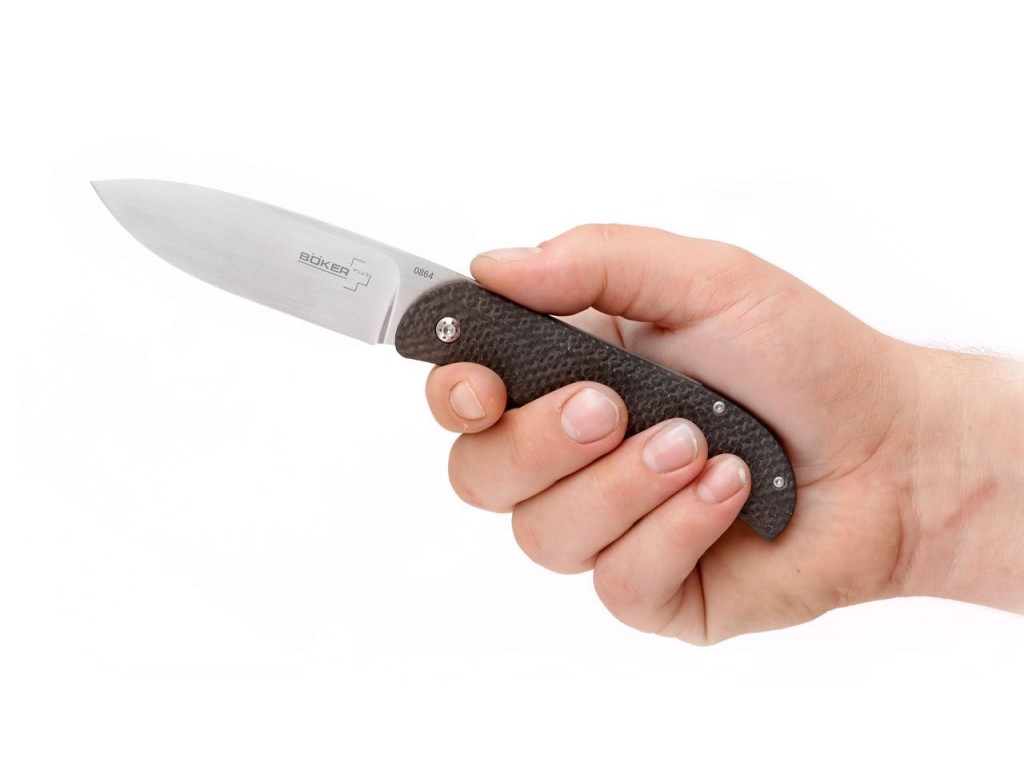 Přední stupnice je vyrobena z uhlíkových vláken, což dává noži kromě jeho výjimečné přitažlivosti také nízkou hmotnost. Abychom splnili obzvláště exkluzivní očekávání kladená na tyto modely, nešetřili jsme také žádné náklady na čepelkovou ocel a jako vhodný materiál jsme vybrali práškový kov CPM-S-35VN. Čepel má jemný ručně nanášený saténový povrch. Všechny modely mají charakteristickou modře eloxovanou titanovou sponu, kterou lze převést ze sklopného na sklopný. Výsledkem je, že rámové zámky Exskelibur představují špičku kopí pro Boker Plus a povýší již tak extrémně populární design na další úroveň.