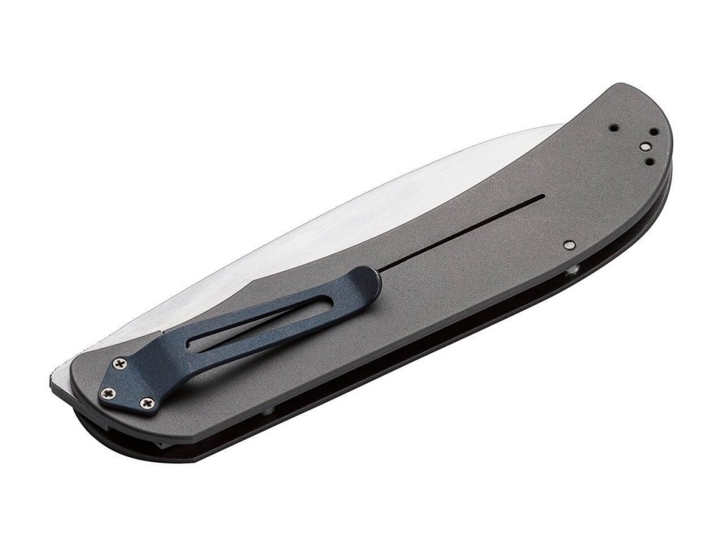 Přední stupnice se skládá z titanu, což dává noži výjimečnou přitažlivost. Abychom splnili obzvláště exkluzivní očekávání kladená na tyto modely, nešetřili jsme také žádné náklady na čepelkovou ocel a jako vhodný materiál jsme vybrali práškový kov CPM-S-35VN. Čepel má jemnou vodorovnou ručně nanášenou saténovou povrchovou úpravu, která se ideálně hodí k matnému, korálkem otryskanému titanu. Všechny modely mají charakteristickou modře eloxovanou titanovou sponu, kterou lze převést ze sklopného na sklopný. Výsledkem je, že rámové zámky Exskelibur představují špičku kopí pro Boker Plus a povýší již tak extrémně populární design na další úroveň. Tloušťka rukojeti tohoto fascinujícího pánského nože je v jeho nejsilnějším bodě sotva 9 mm (měřeno bez spony). Dvě malé hmoždinky ve tvaru hmoždinky slouží k vizuálnímu zdůraznění lehkosti rukojeti, čímž je rukojeť zcela otevřená.