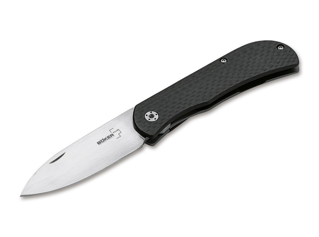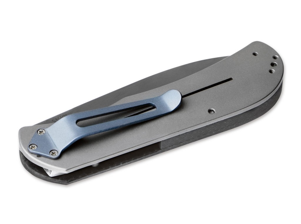 Přední stupnice je vyrobena z uhlíkových vláken, což dává noži kromě jeho výjimečné přitažlivosti také nízkou hmotnost. Abychom splnili obzvláště exkluzivní očekávání kladená na tyto modely, nešetřili jsme také žádné náklady na čepelkovou ocel a jako vhodný materiál jsme vybrali práškový kov CPM-S-35VN. Čepel má jemný ručně nanášený saténový povrch. Všechny modely mají charakteristickou modře eloxovanou titanovou sponu, kterou lze převést ze sklopného na sklopný. Výsledkem je, že rámové zámky Exskelibur představují špičku kopí pro Boker Plus a povýší již tak extrémně populární design na další úroveň.