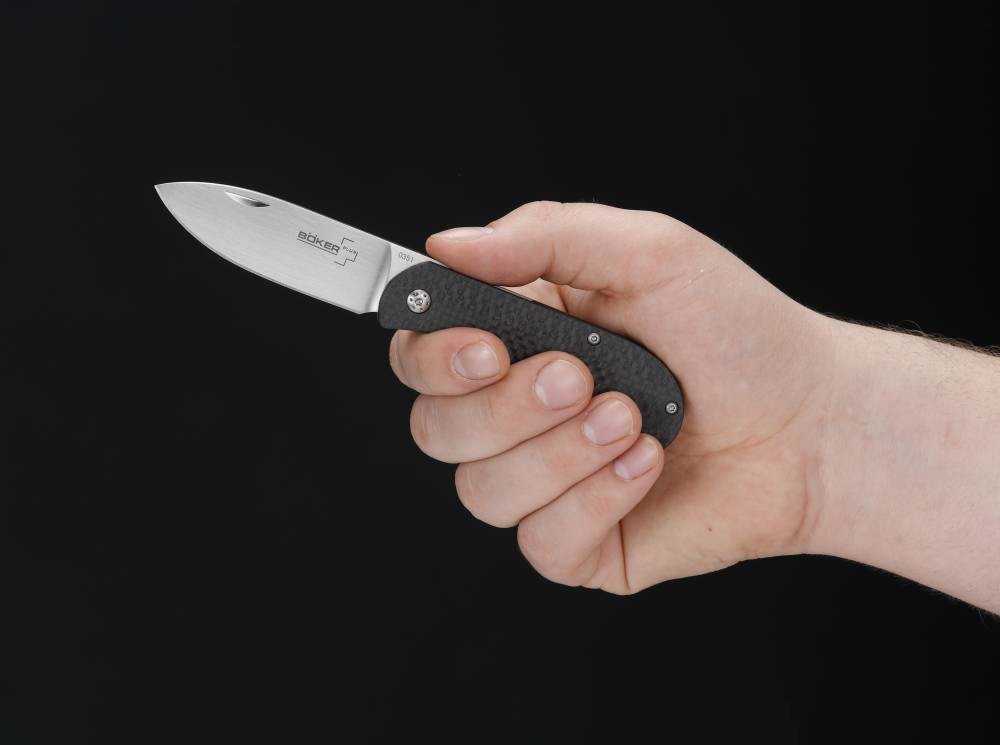 Tloušťka rukojeti tohoto fascinujícího pánského nože je v jeho nejsilnějším bodě sotva 9 mm (měřeno bez spony). K přizpůsobení stupnice rukojeti se používá jednodílný distanční prvek z uhlíkových vláken. Tato malá verze má stejné prémiové funkce jako její větší bratr, ale s gramáží 49 gramů je při stejné tloušťce rukojeti a čepele opět výrazně lehčí.