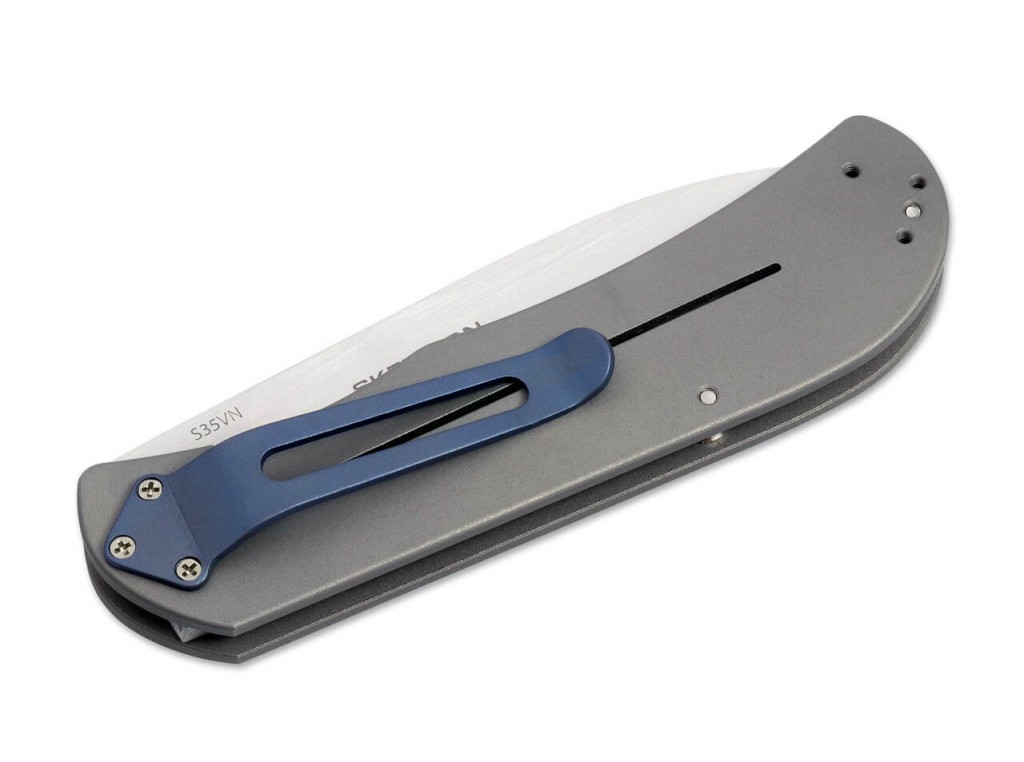 Přední stupnice se skládá z titanu, což dává noži výjimečnou přitažlivost. Abychom splnili obzvláště exkluzivní očekávání kladená na tyto modely, nešetřili jsme také žádné náklady na čepelkovou ocel a jako vhodný materiál jsme vybrali práškový kov CPM-S-35VN. Čepel má jemnou vodorovnou ručně nanášenou saténovou povrchovou úpravu, která se ideálně hodí k matnému, korálkem otryskanému titanu. Všechny modely mají charakteristickou modře eloxovanou titanovou sponu, kterou lze převést ze sklopného na sklopný. Výsledkem je, že rámové zámky Exskelibur představují špičku kopí pro Boker Plus a povýší již tak extrémně populární design na další úroveň. Tloušťka rukojeti tohoto fascinujícího pánského nože je v jeho nejsilnějším bodě sotva 9 mm (měřeno bez spony). Dvě malé hmoždinky ve tvaru hmoždinky slouží k vizuálnímu zdůraznění lehkosti rukojeti, čímž je rukojeť zcela otevřená. Tato malá verze má stejné prémiové funkce jako její větší bratr, ale u 59 gramů je opět výrazně lehčí při stejné tloušťce rukojeti a čepele.