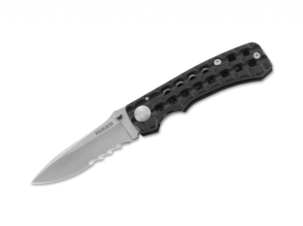Ruger Go-N-Heavy je v podstatě prototyp taktické složky. Go-N-Heavy, navržený legendou výroby nožů Billem Harseyem z Oregonu, má rukojeť s texturou pro jistou přilnavost vyrobenou z eloxovaného hliníku s tvrdým povlakem, jehož textura připomíná kolejnice na moderních ručních zbraních. Čepel spouštěcího bodu 8Cr13MoV je spojena se zámkem vložky a má trvanlivou povrchovou úpravu stonewash. Bez klipu. Dodáváno s nylonovým pouzdrem.