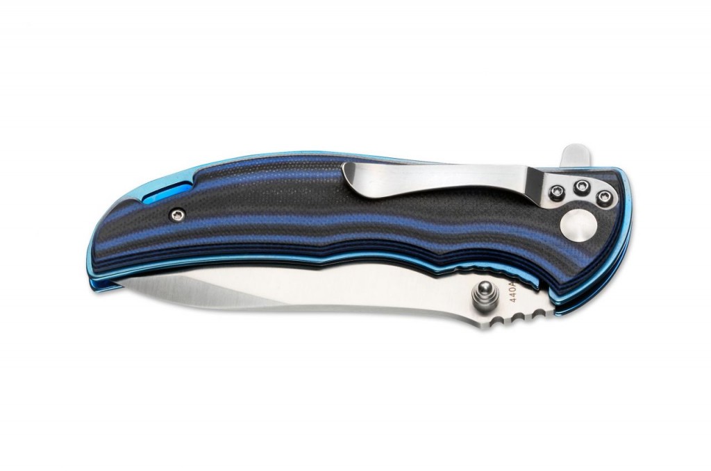 Čepel 440A. Čepele se snadno otevře ručně pomocí palecového čepu nebo ploutve. Čepel je zachycen krásnými modrými ocelovými vložkami (linerovým zámkem). Modročerné váhy G-10 poskytují příjemnou manipulaci. Je vybaven sponou a šňůrkou