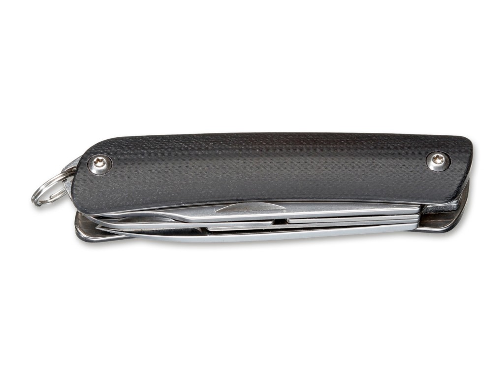 S délkou čepele 5,2 cm je Boker Plus Tech Tool Mini mnohem univerzálnější, praktičtější a efektivnější než mnoho jiných nožů na klíčenky. Je však stále dostatečně malý na to, aby byl bez problémů přidán do klíčenky. Tech Tool Mini má všechny prémiové vlastnosti svého velkého bratra: leštěná čepel s dutým výbrusem z materiálu Sandvik 12C27, tvarované černé stupnice rukojeti G10 a šroubovaná rukojeť. Pevná smyčka a kroužek na klíče jsou součástí standardní výbavy Tech Tool Mini. Má také nůžky, multifunkční čepel se šroubovákem, řezač pásu a otvírák na lahve.