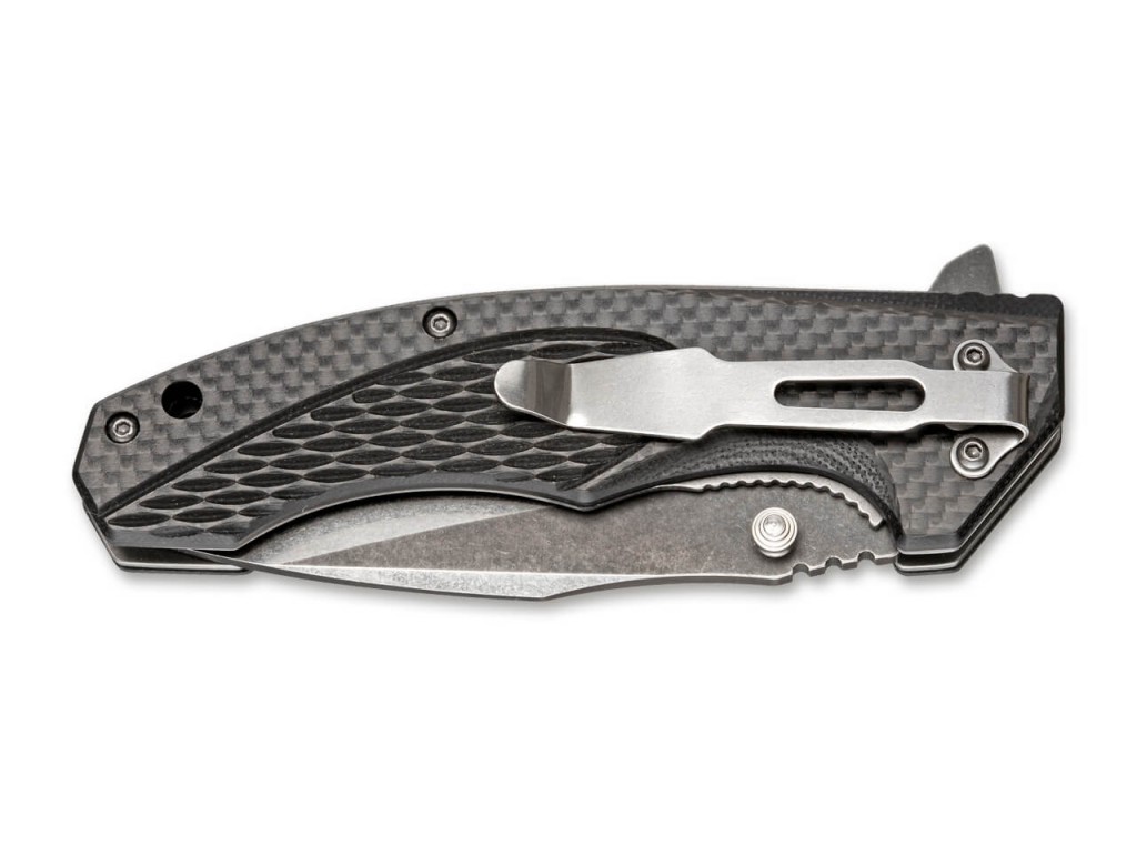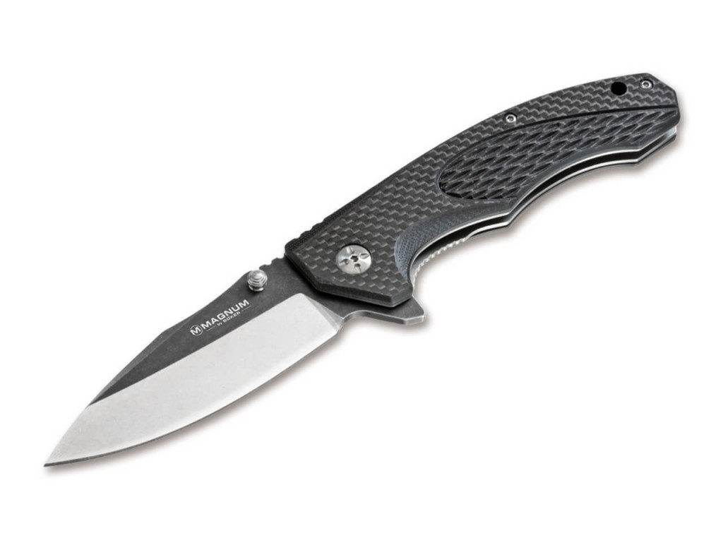 Černá rukojeť a tmavá čepel dodávají Magnum Omen vhodně taktický vzhled. Čepel 440A má povrchovou úpravu stonewash a lze ji otevřít pomocí ploutve nebo oboustranného palce. Čepel zajišťuje robustní linerlock. Váhy rukojeti se skládají z uhlíkových vláken s texturovanými povrchy pro extra bezpečné uchopení. Vroubkovaná opěrka palce zvyšuje stabilitu a bezpečnost při řezání. S klipem (špičkou dolů).